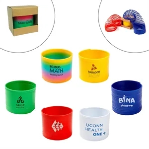 This jumbo 3" round spring toy adds a fun twist to any marketing campaign! Perfect for both kids and adults, this classic toy bounces, stretches, and even walks down stairs. Every time it compresses, your logo remains visible, ensuring lasting brand exposure. Available in vibrant solid colors or eye-catching rainbow designs, it comes packaged in a stylish kraft gift box with a clear window for a polished presentation. A great giveaway for events, promotions, and playful branding! Complies with CPSIA, Prop 65.