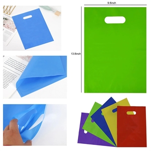 The plastic bag is made with high quality polyethylene plastic, durable and waterproof. The thickness of the bags are 2.5mil which are perfect for light usage. It measures 13.8"x9.8", can be used as goodie bag, party favor bag, gift bag, or event bag. Other thicknesses and sizes also available. Our assorted bags are equipped with die cut handles, perfect for easy carry. When not in use, these bags fold flat for easy storage.