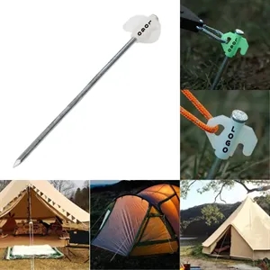 The luminescent stainless steel tent ground stake, measuring 8.3 inches in total length. It boasts two secure attachment options: securing it onto anti-slip holes or clipping it onto quick hooks. This stake not only guarantees the stability of guylines but also ensures easy identification and retrieval.